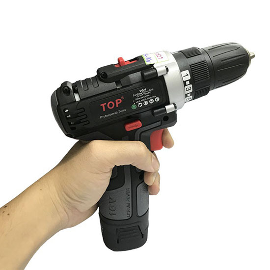 - Phần đầu sản phẩm được trang bị bộ điều chỉnh cấp độ lực với 16 cấp và 1 cấp độ chuyên khoan, giúp người dùng có thể điều chỉnh từng cấp độ để phù hợp với từng công việc khác nhau. - Sản phẩm khoan pin Top còn cho người dùng điều chỉnh được cả số vòng quay với 2 cấp độ: thấp 0-450v/p và cao 0-1.600v/p - Ngoài ra, nhà sản xuất còn thiết kế cho sản phẩm 1 đèn Led nằm gần công tắc, để có thể sử dụng được trong những nơi gốc khuất thiếu ánh sáng. - Phần cán cầm được thiết kế với các đường cong chính xác với bàn tay của người dùng, giúp cầm nắm êm tay, thoải mái trong lúc thao tác. - Điều quan trọng hơn nữa là bộ sản phẩm được tích hợp thêm đế sạc pin rời 16 Volt, có đèn báo hiệu khi pin được sạc đầy. Người dùng không cần phải canh thời gian, chỉ cần đợi đèn báo chuyển sang xanh lá là báo hiệu pin đã được sạc đầy.